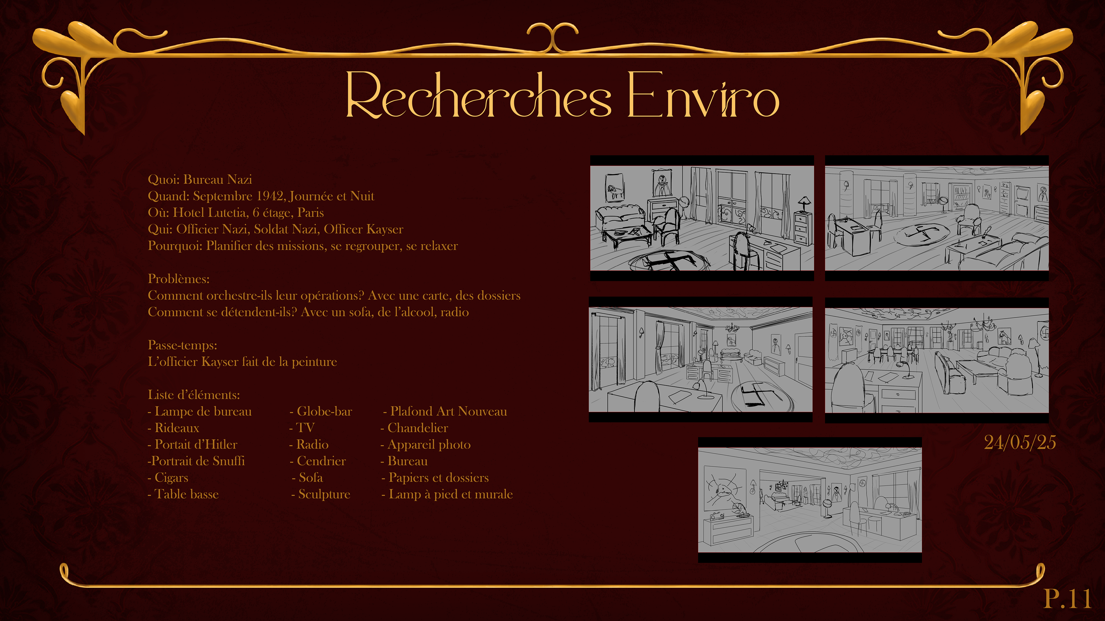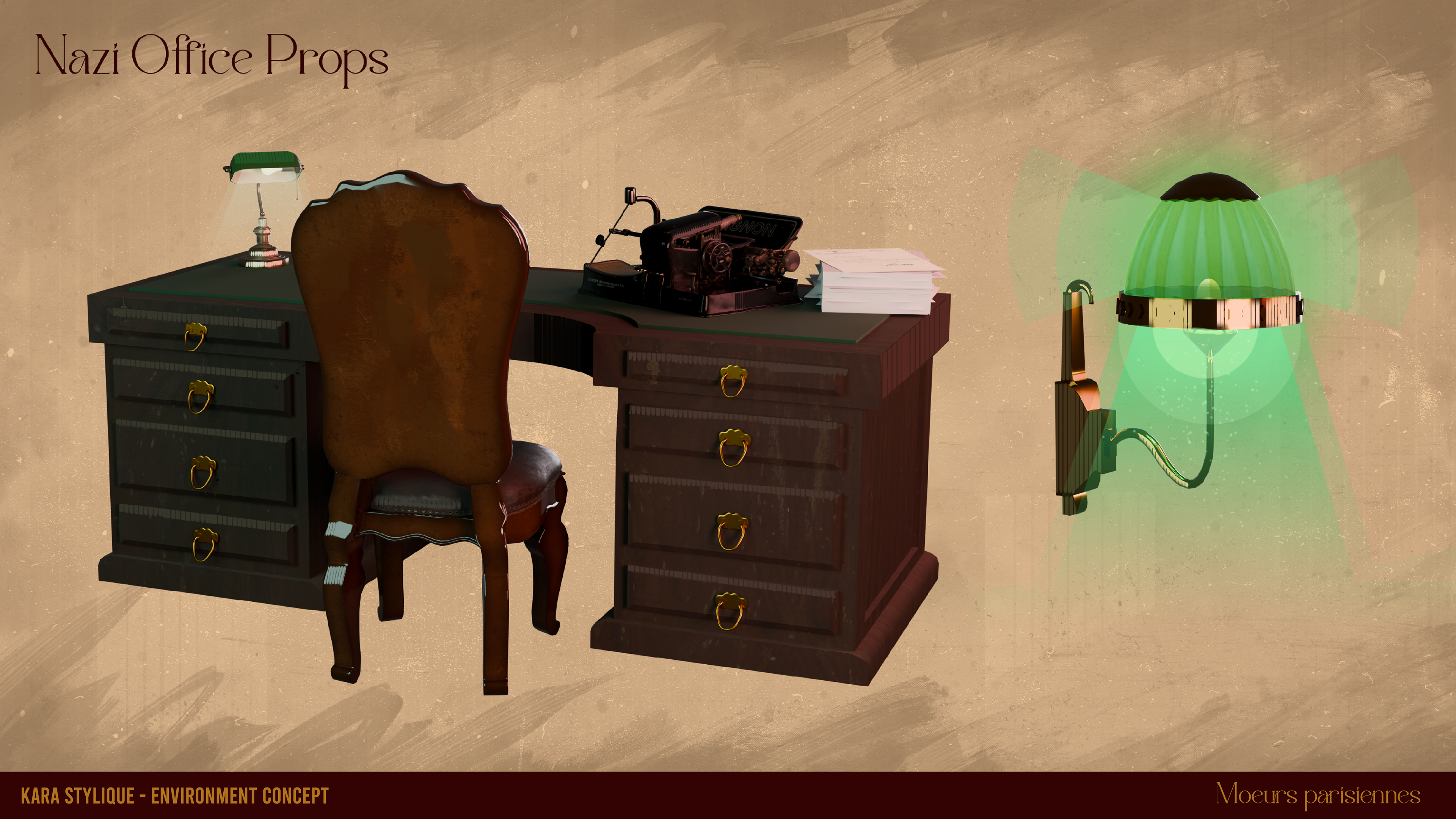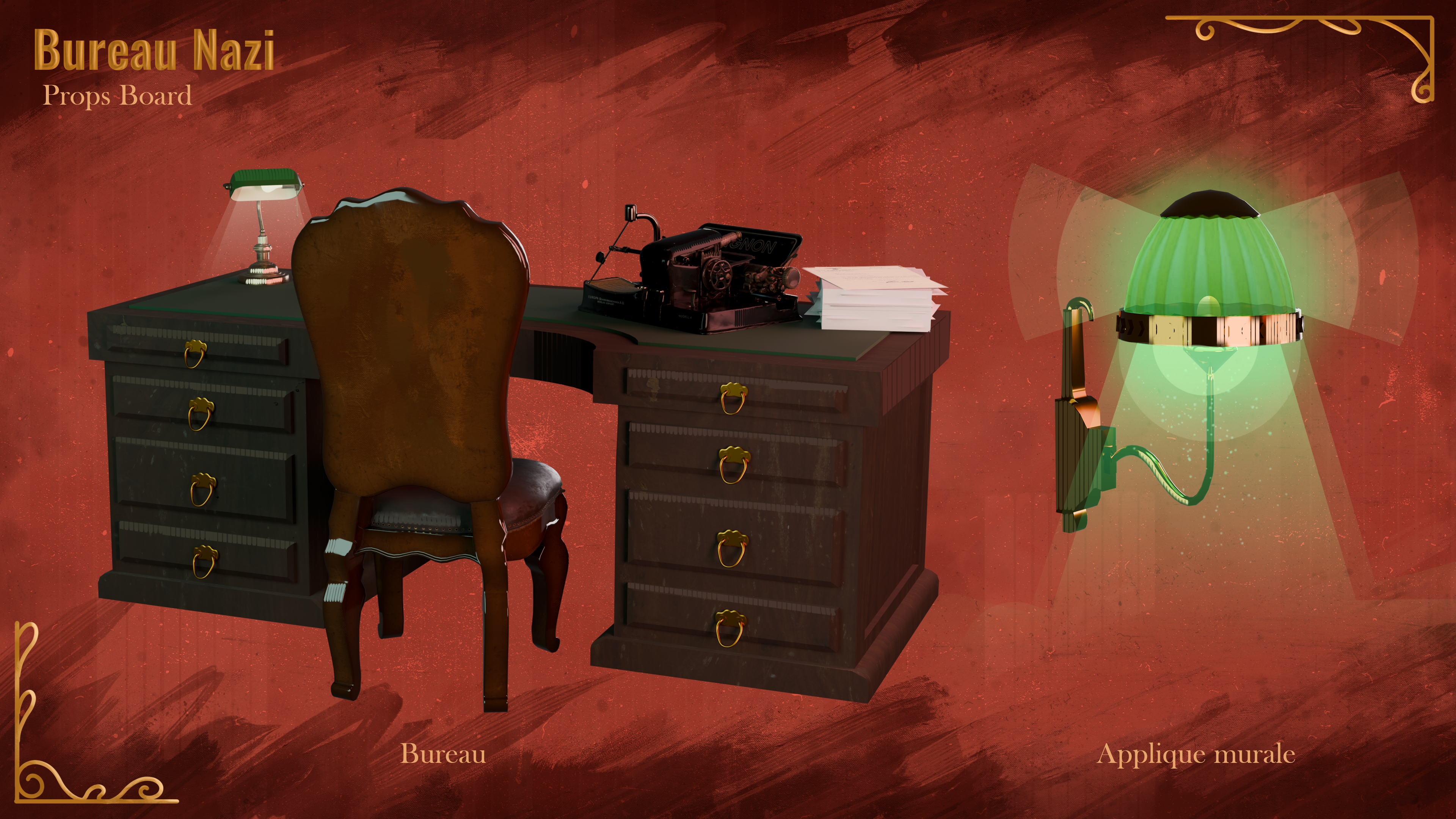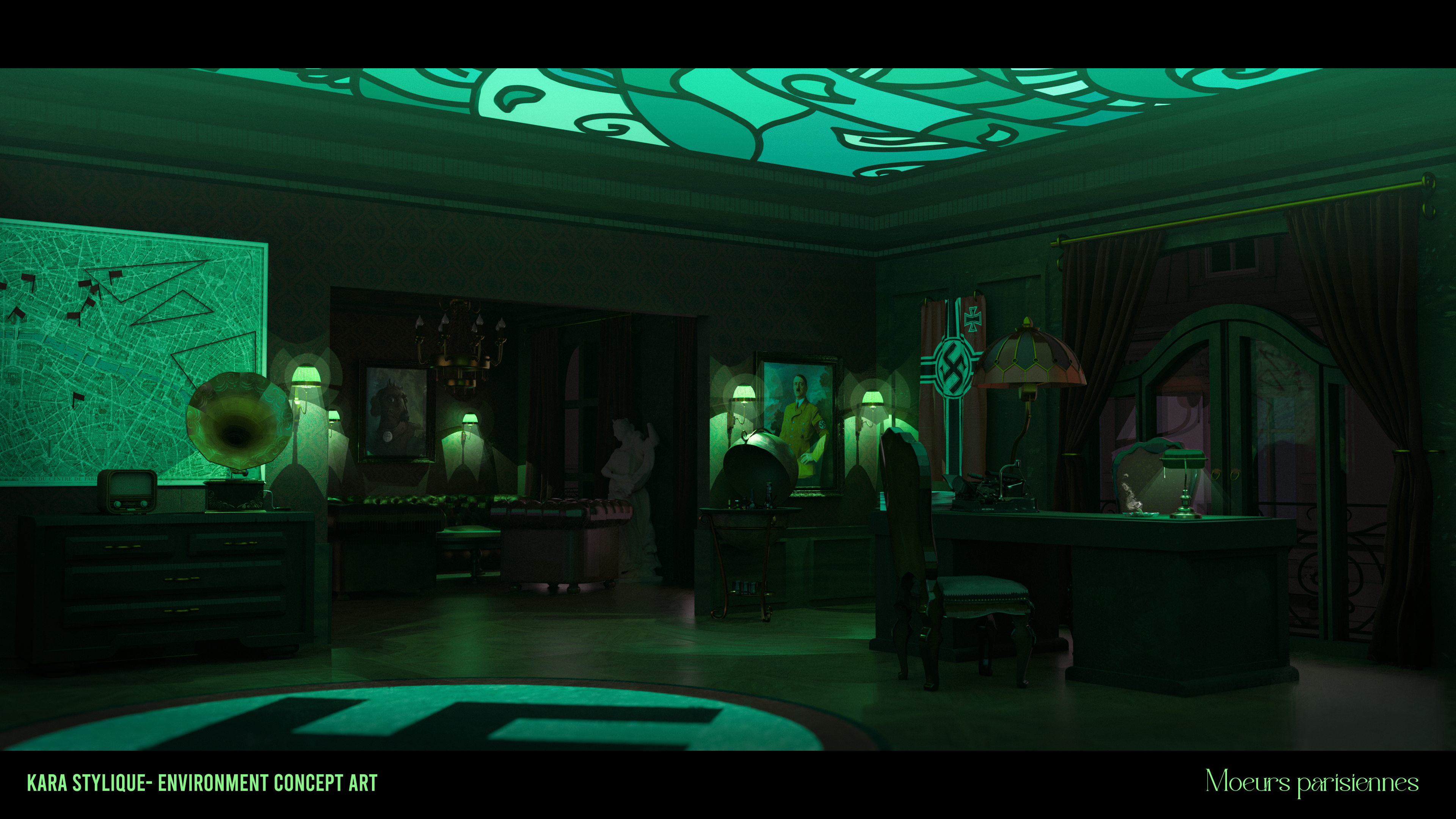 The Nazi office appears in three different scenes throughout the game, so I had to create three distinct color palettes to reflect the changing moods: