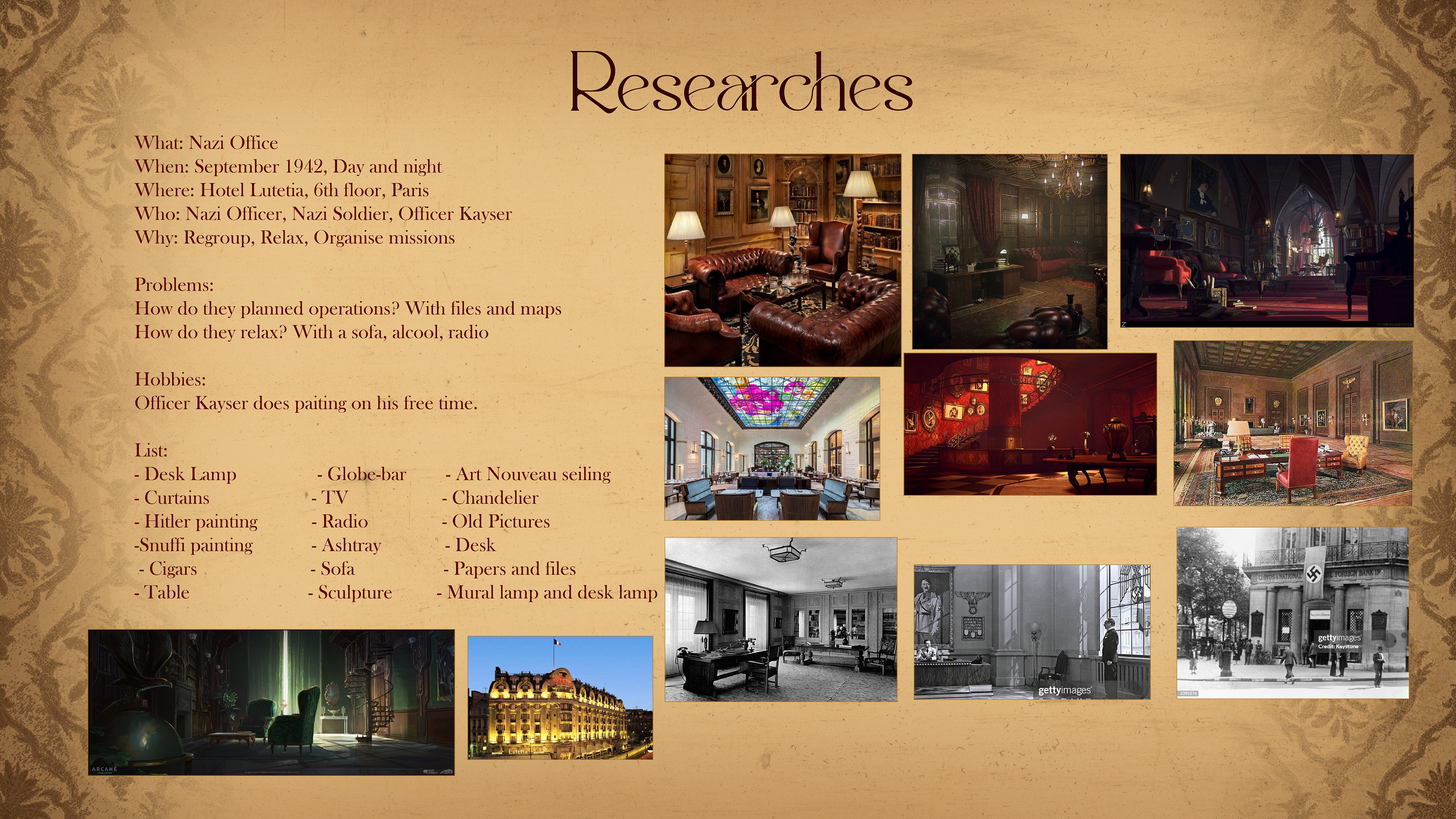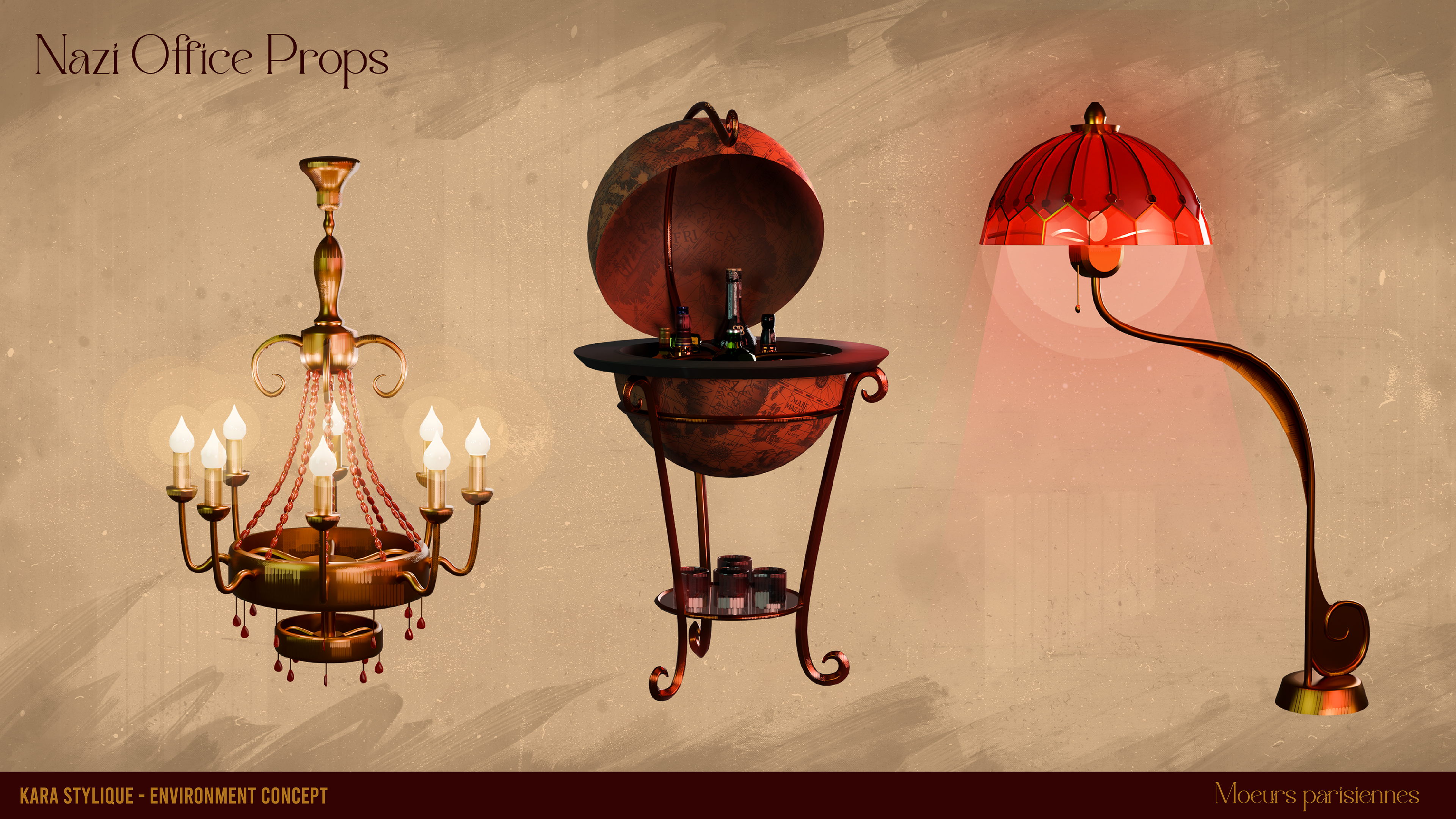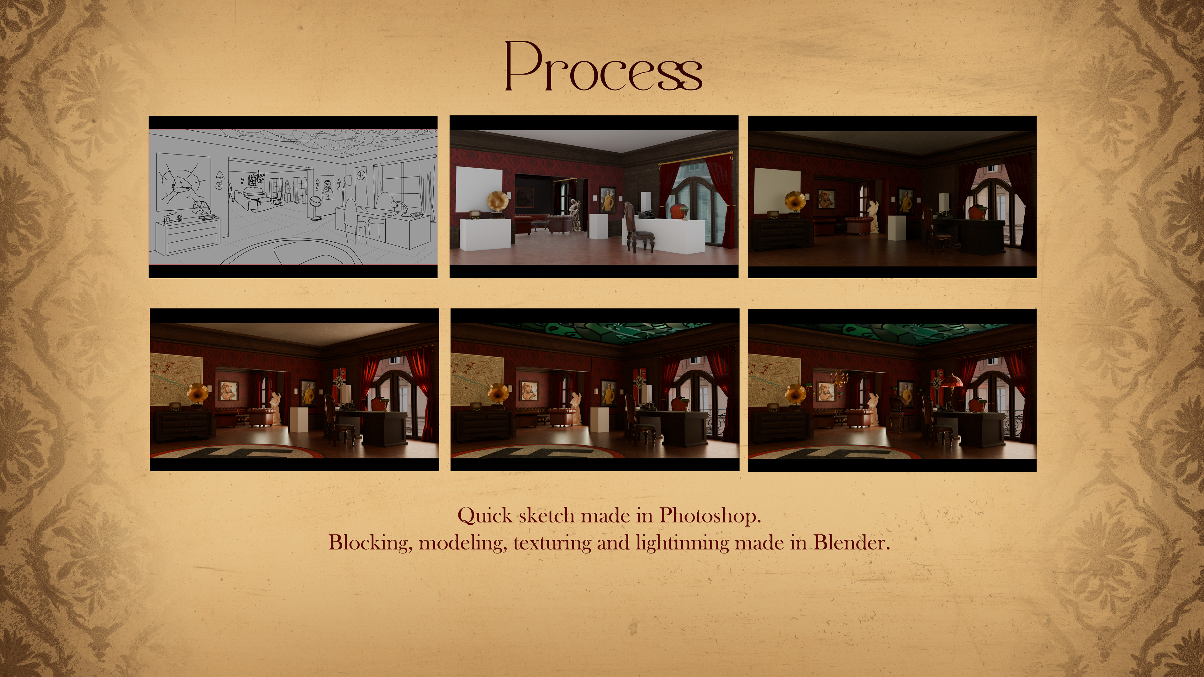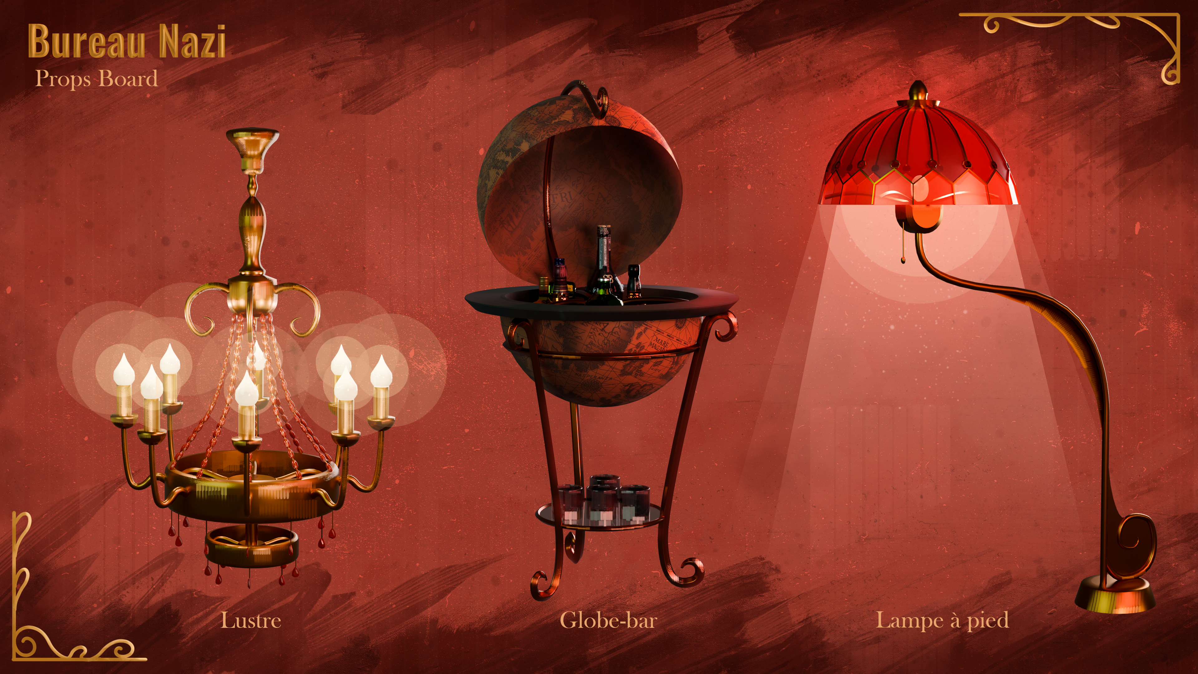 The Nazi office appears in three different scenes throughout the game, so I had to create three distinct color palettes to reflect the changing moods: