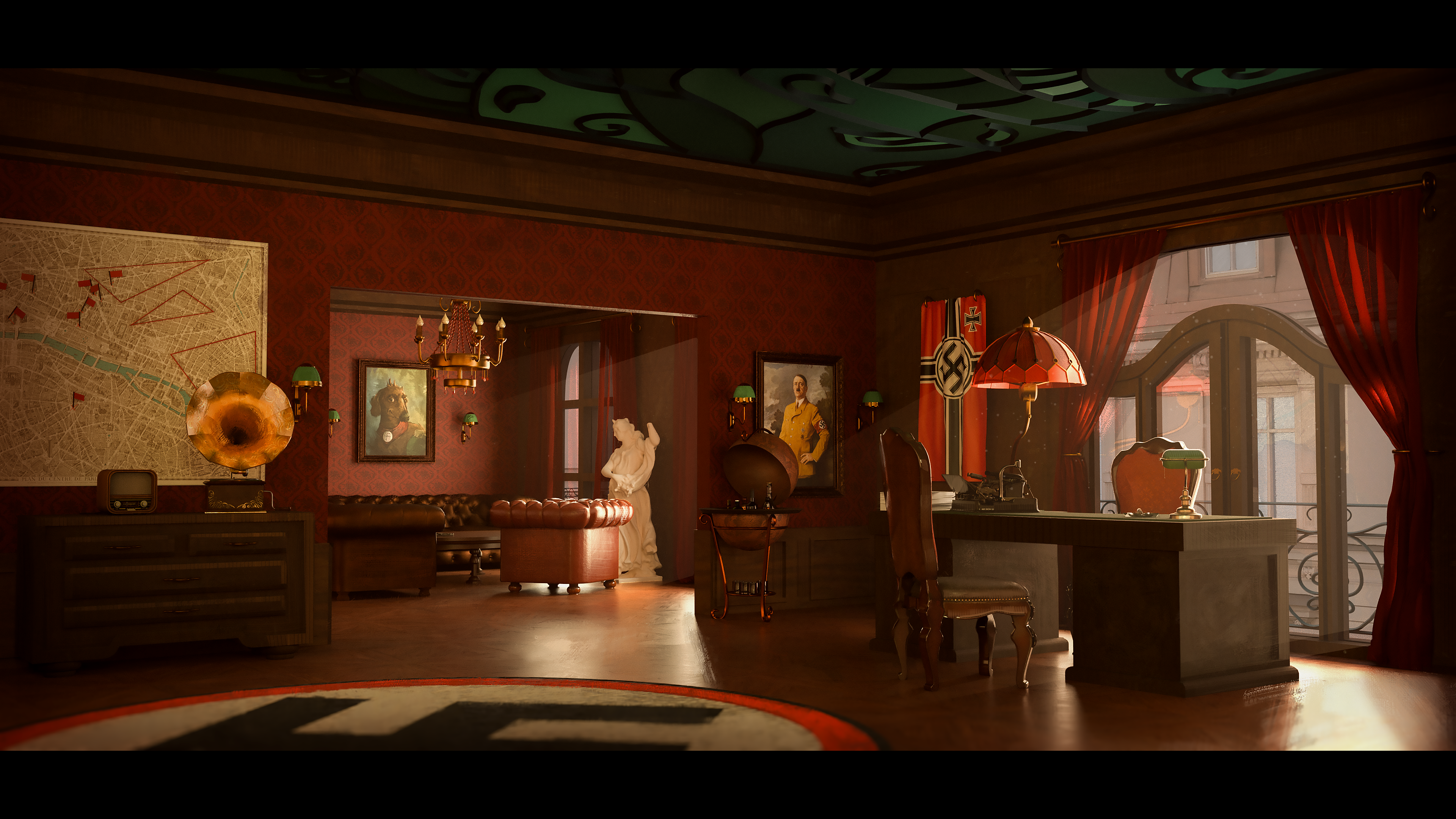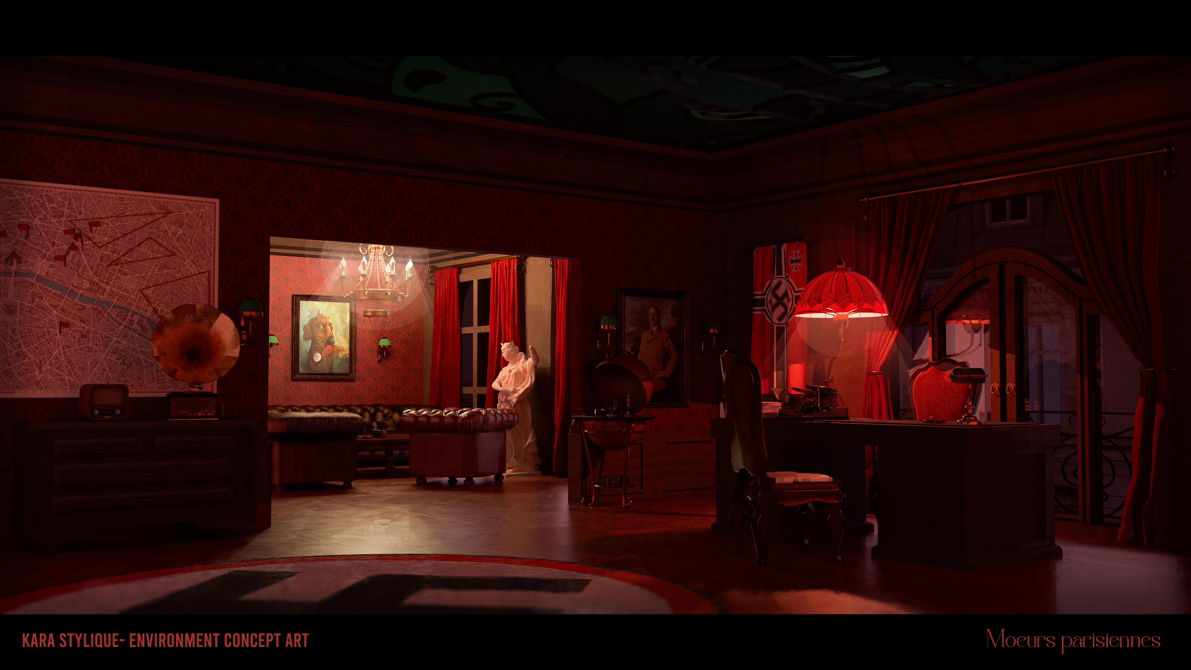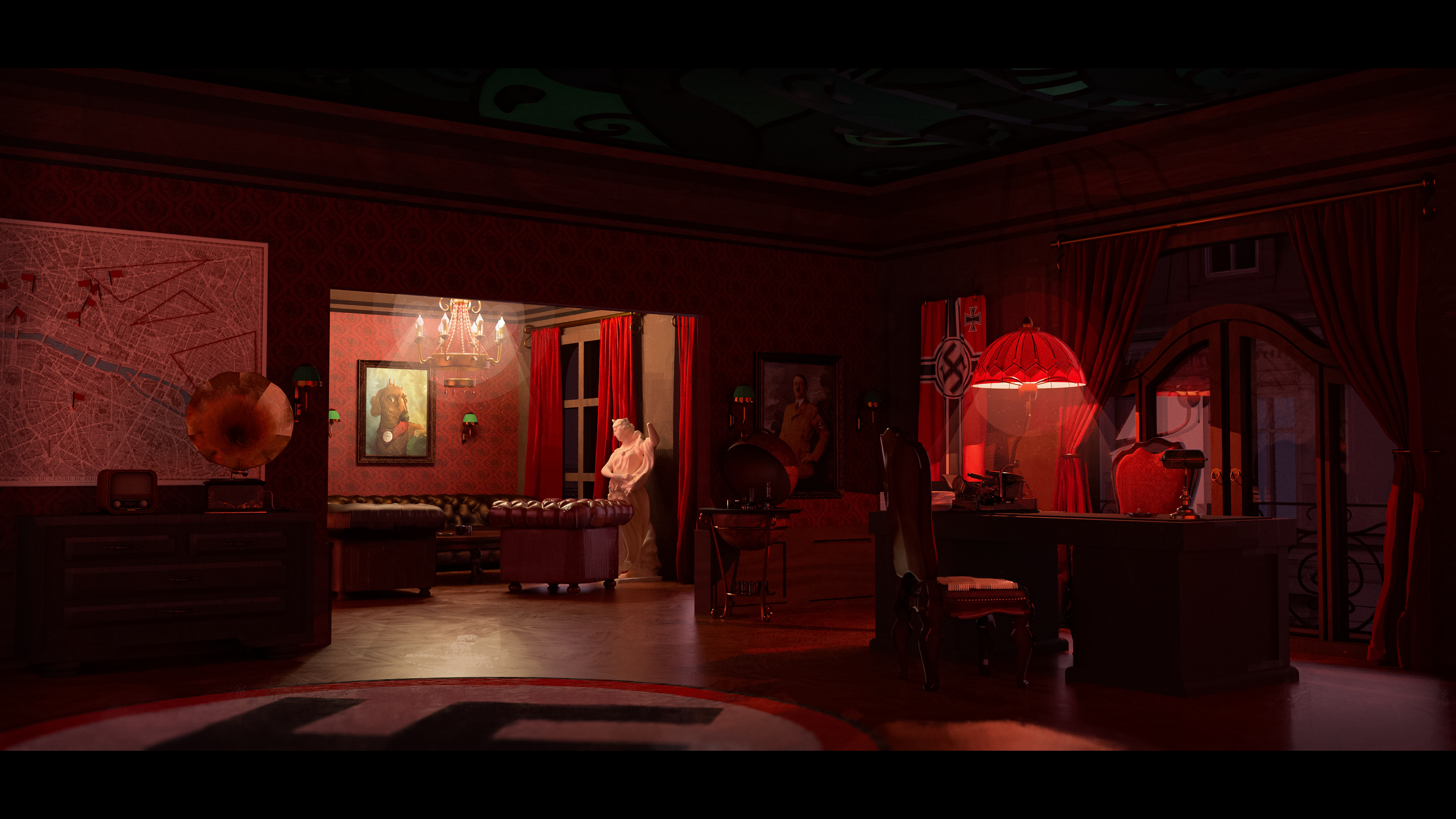 A dark, intimate red for the late-night Nazi meeting,