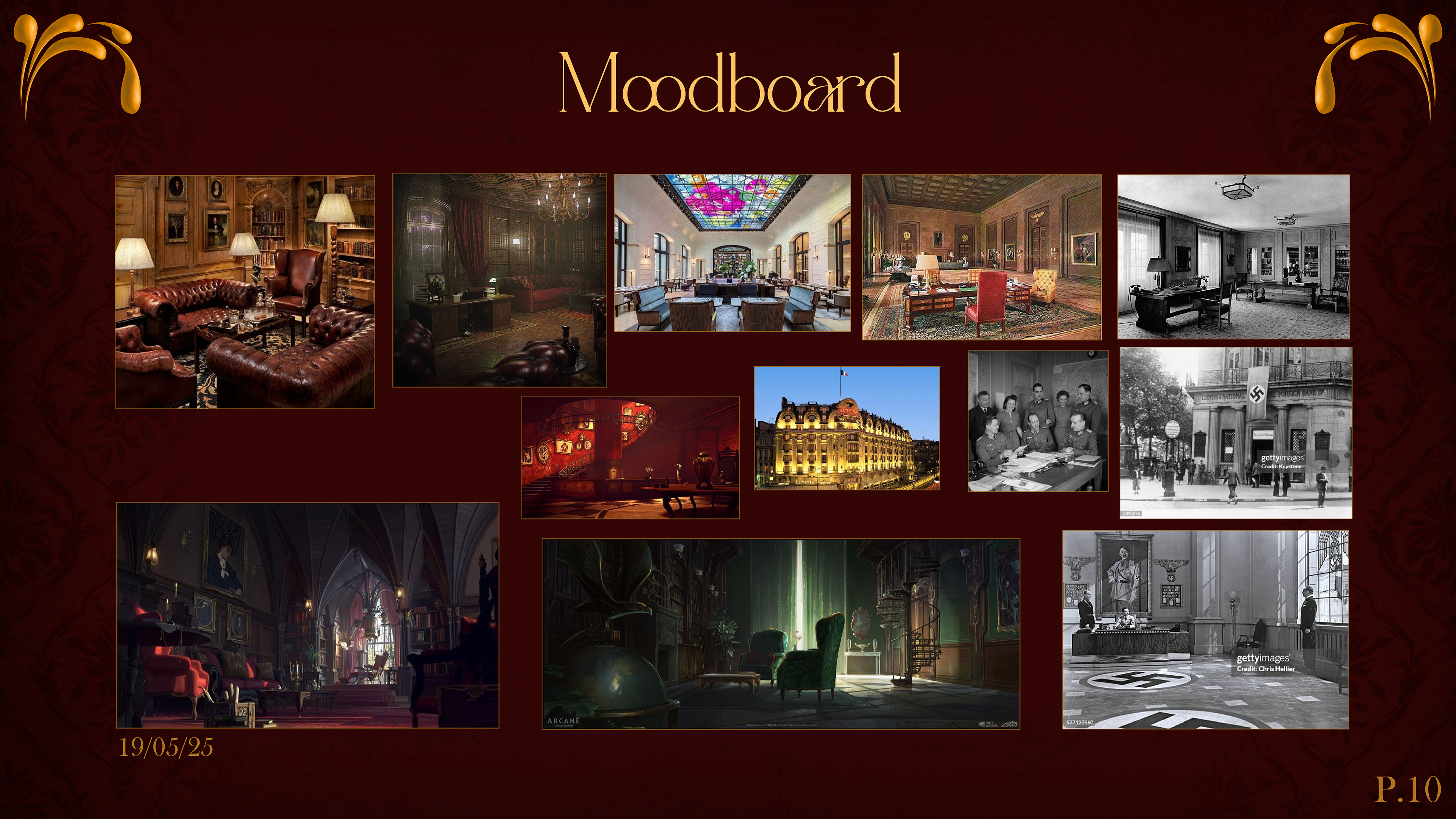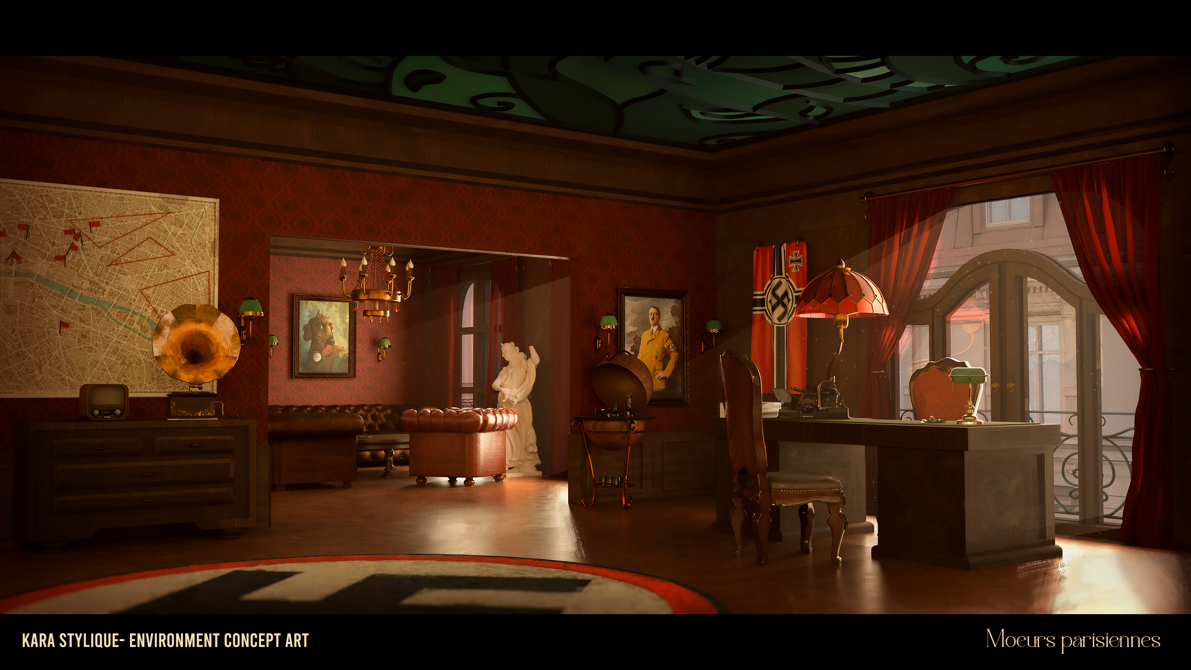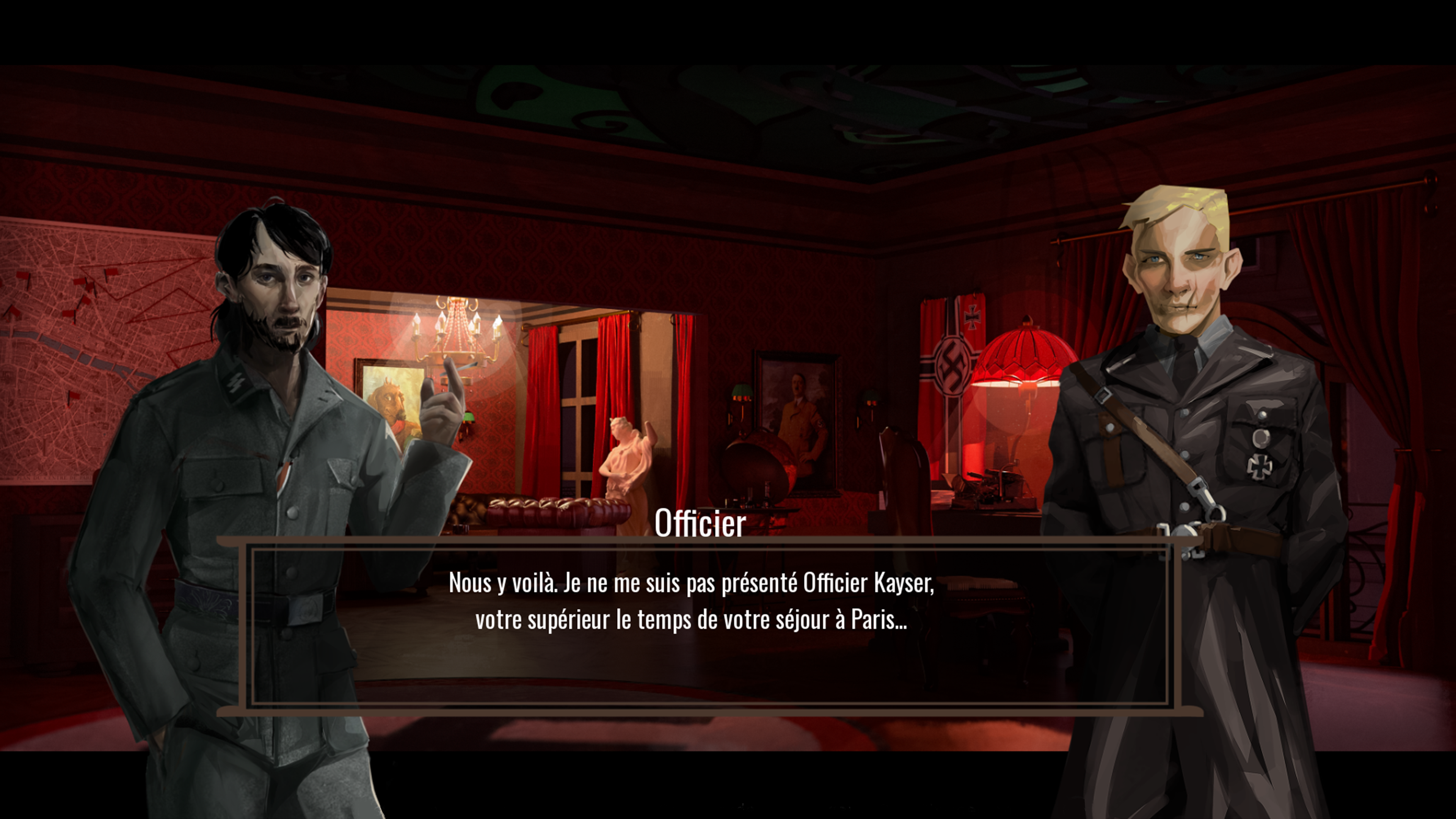 A dark, intimate red for the late-night Nazi meeting,