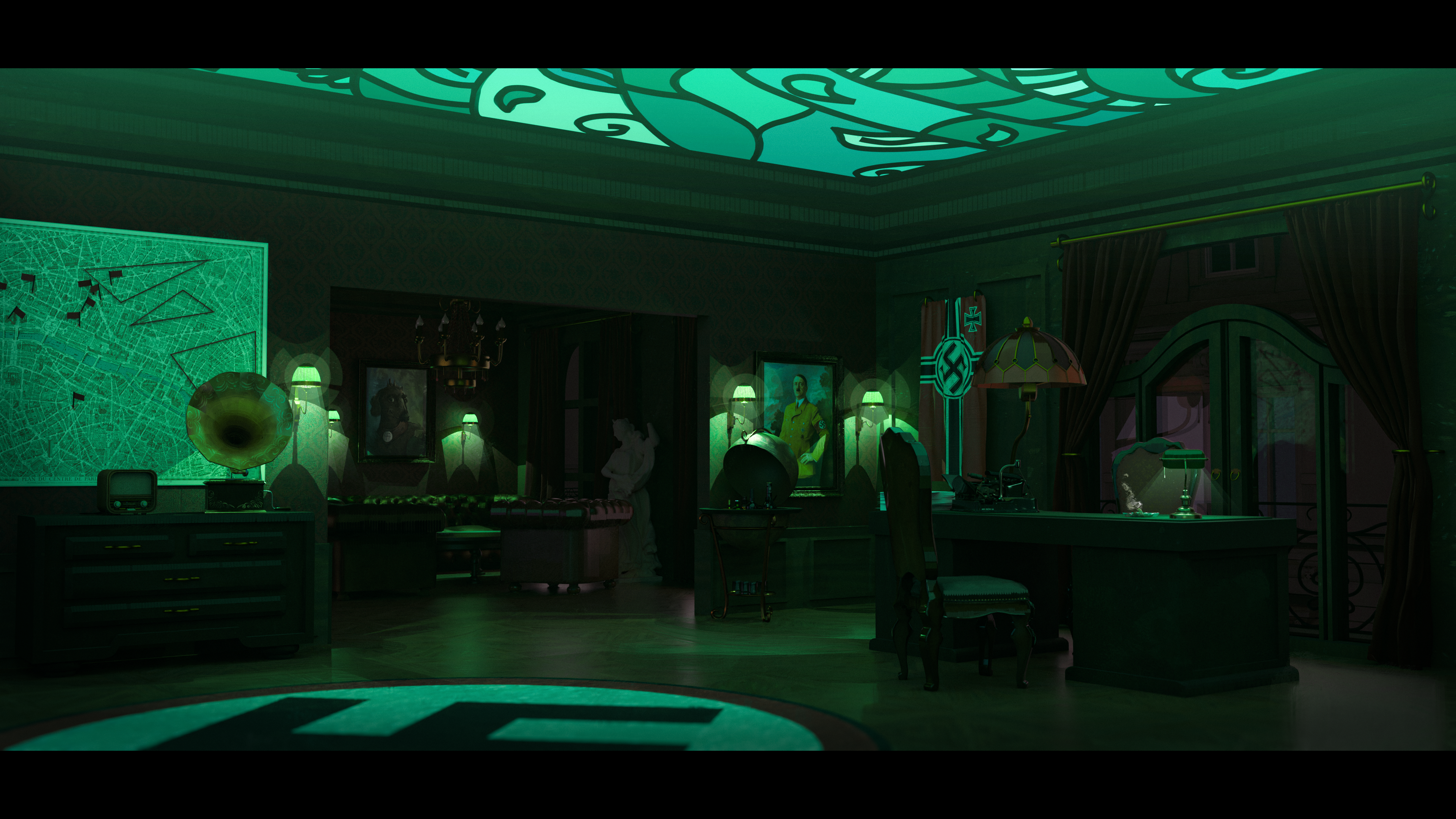 A tense green atmosphere for the Resistance-related scene,