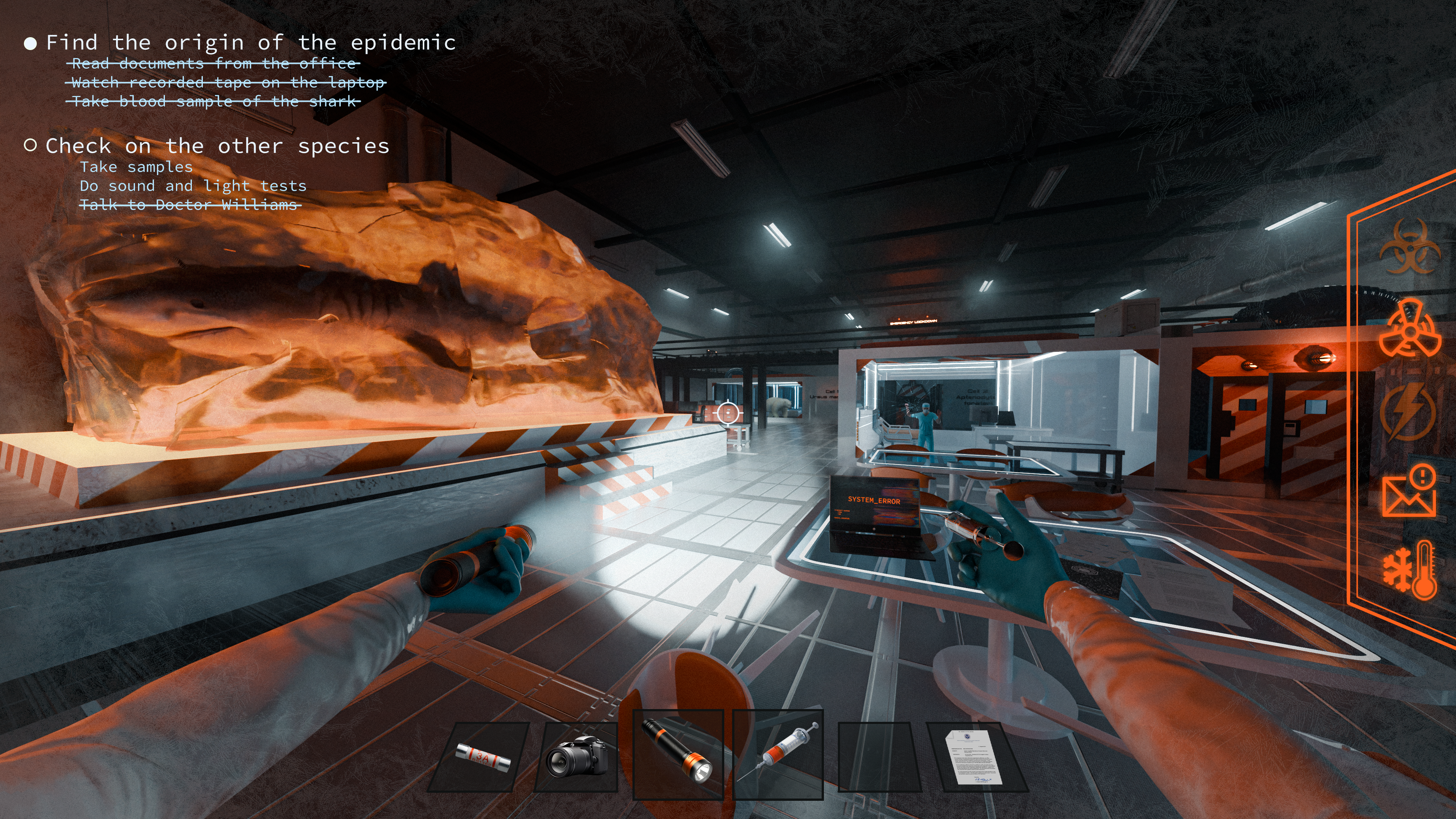 We were warned but didn't listen... The permafrost melted and with him the corpse of a centuries old shark. WIthin him, a deadly prehistoric virus killing everything on his path. Trapped in the lab, will you find the vaccin that must save humanity from it's decay?